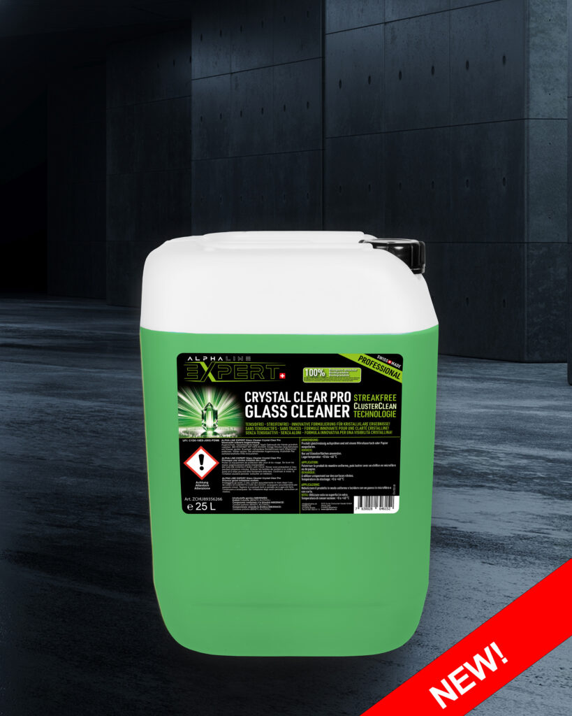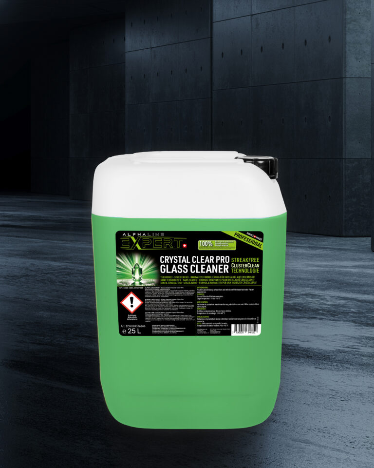 Der ALPHA LINE EXPERT Glasreiniger Crystal Clear Pro wurde speziell für die einfache, streifenfreie Reinigung von Glasoberflächen entwickelt. Die innovative Formel löst organische Verschmutzungen, agglomeriert diese zu leicht abwischbaren Partikeln und verhindert ein erneutes Anhaften/Verschmieren auf Glasoberflächen. Garantiert streifenfrei! Beseitigt zuverlässig Fett, Nikotin und Insektenrückstände. Geeignet für alle Glas- und Spiegeloberflächen im Innen- und Aussenbereich. Für eine streifenfreie, klare Sicht ohne Ammoniak!